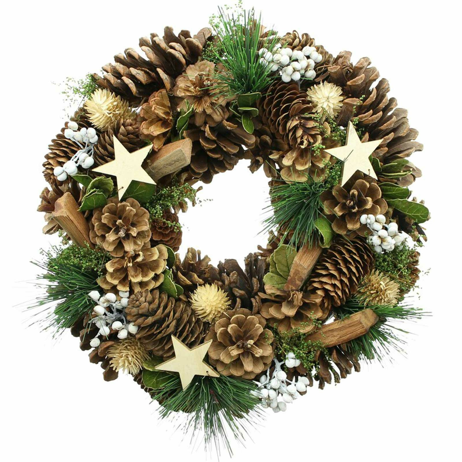 Kransen zijn de perfecte decoratieve items om de voordeur op een aantrekkelijke, uitnodigende en individuele manier te versieren. De kunstig vormgegeven, cirkelvormige decoratieartikelen kunnen niet alleen als deurkrans, maar ook als tafelkrans, wandkrans of raamdecoratie worden gebruikt. Hoe u uw sierkrans ook wilt gebruiken, de kransen zien er bijzonder goed uit wanneer ze zijn aangepast aan het huidige seizoen. Vooral in de kersttijd kunnen de kransen ook met lichtjes gespeeld worden. Deze geweldige, zeer weelderige krans is ideaal als opvallende en bijzonder unieke wanddecoratie. De krans is voorzien van diverse natuurlijke materialen en kunststof bessen. De kleuren passen perfect in het sprankelende kerstseizoen. De natuurlijke krans staat geweldig op elke muur! Een bijzonder pluspunt is dat de kerstkrans ook aan de buitenzijde kan worden opgehangen (onder een afdak blijven ze mooier)en zo uw gasten bij de entreedeur met een glimlach verwelkomt.